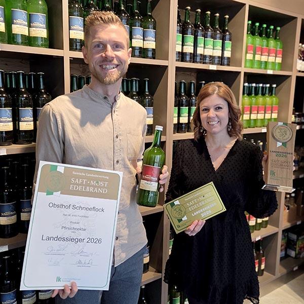 Mit unseren Säften erringen wir jedes Jahr Spitzenauszeichnungen bei Verkostungen. 2026 wurde unser Pfirsichnektar Landessieger!
